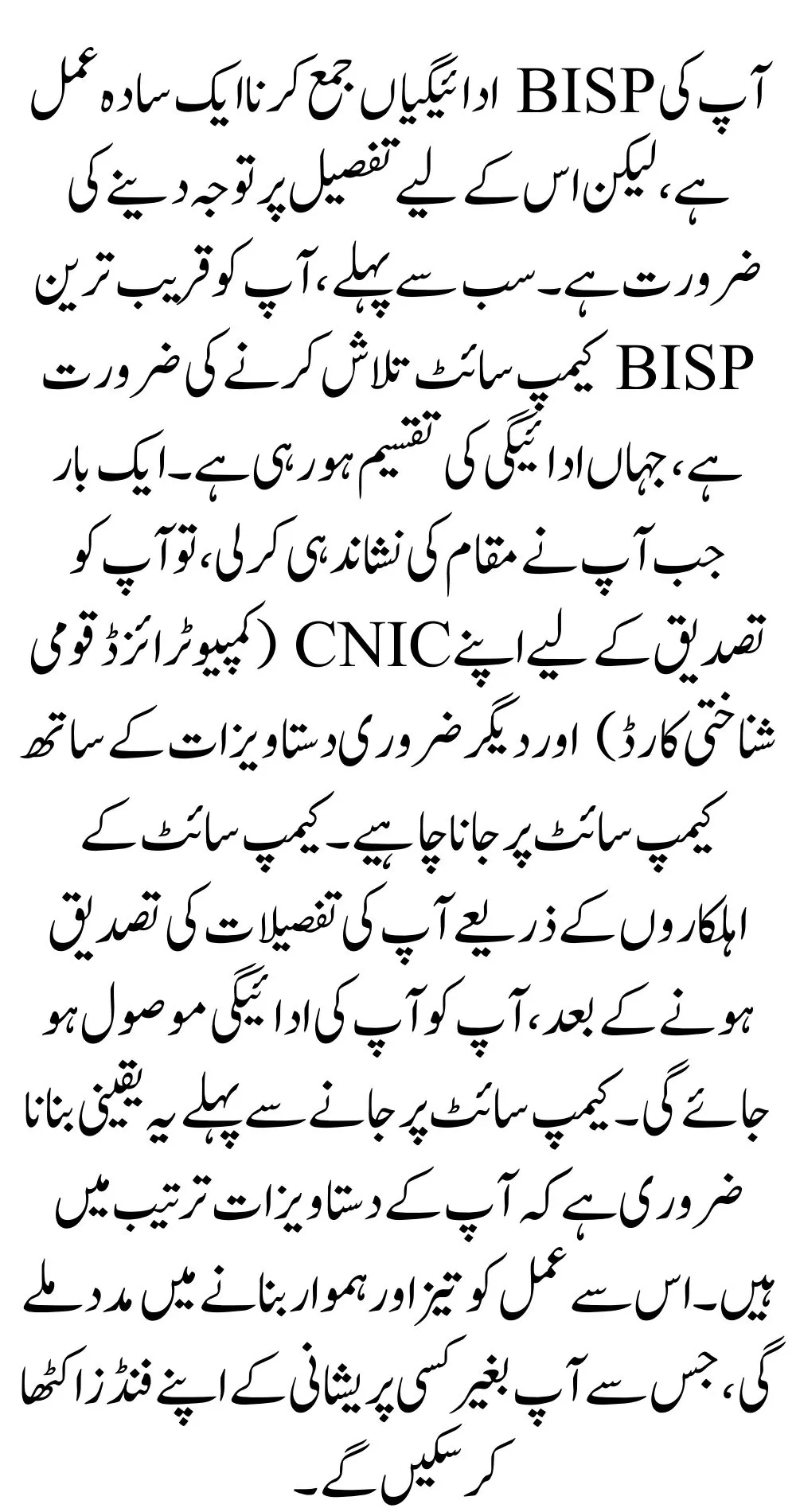 Collecting your BISP payments is a simple process, but it requires careful attention to detail. First, you need to find the nearest BISP campsite, where the payment distribution is taking place. Once you have identified the location, you should visit the campsite with your CNIC (Computerized National Identity Card) and other necessary documents for verification. After your details have been verified by the officials at the campsite, you will receive your payment. It is essential to ensure that your documents are in order before visiting the campsite. This will help make the process quick and smooth, allowing you to collect your funds without any problems.