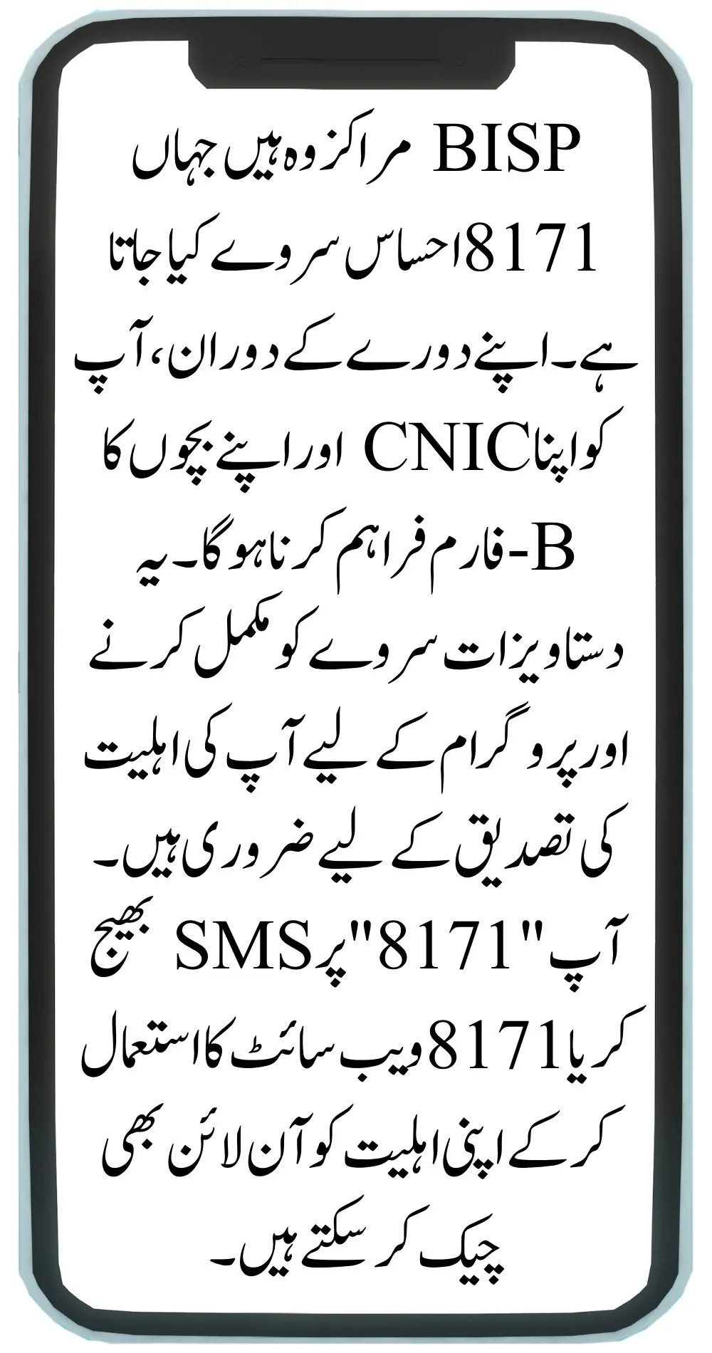 The BISP Centers are where the 8171 Ehsaas Survey is conducted. During your visit, you will need to provide your CNIC and your children’s B-Form. These documents are necessary to complete the survey and verify your eligibility for the program. You can also check your eligibility online by sending an SMS to “8171” or using the 8171 Website.