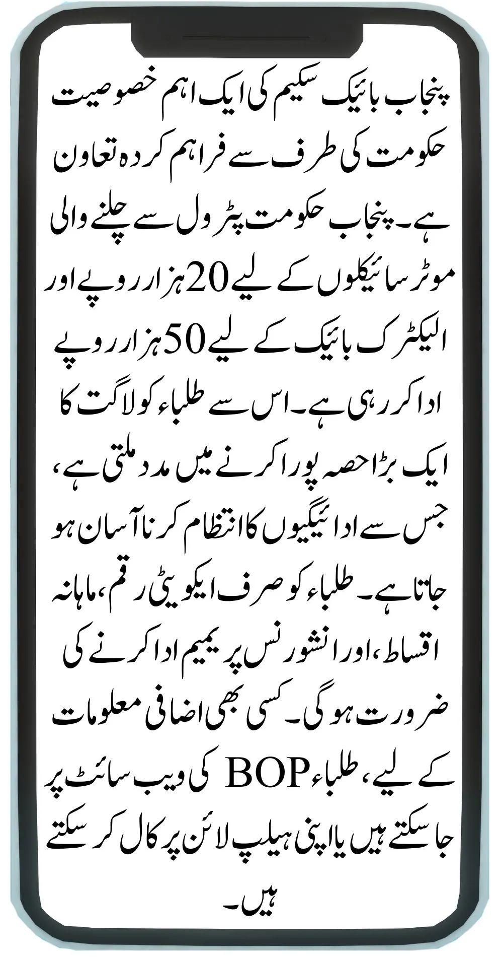 One of the key features of the Punjab Bike Scheme is the support provided by the government. The Punjab government is paying Rs 20,000 for petrol-powered bikes and Rs 50,000 for electric bikes. This helps students cover a large part of the cost, making it easier to manage the payments. Students will only need to pay the equity amount, monthly installments, and insurance premium. For any additional information, students can visit the BOP website or call their helpline.