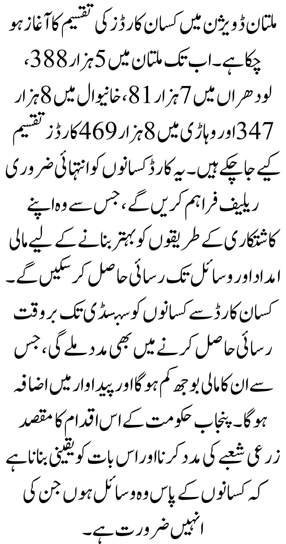 As of now, 5,388 cards have been distributed in Multan, 7,081 in Lodhran, 8,347 in Khanewal, and 8,469 in Vehari. The distribution is ongoing, and more farmers will receive their cards in the coming weeks.