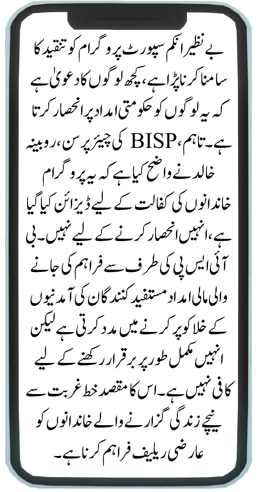 The Benazir Income Support Program has faced criticism, with some claiming that it makes people dependent on government support. However, BISP’s chairperson, Rubina Khalid, has clarified that the program is designed to support families, not make them dependent. The financial aid provided by BISP helps fill the gaps in beneficiaries’ incomes but is not enough to fully sustain them. It is meant to provide temporary relief to families living below the poverty line.