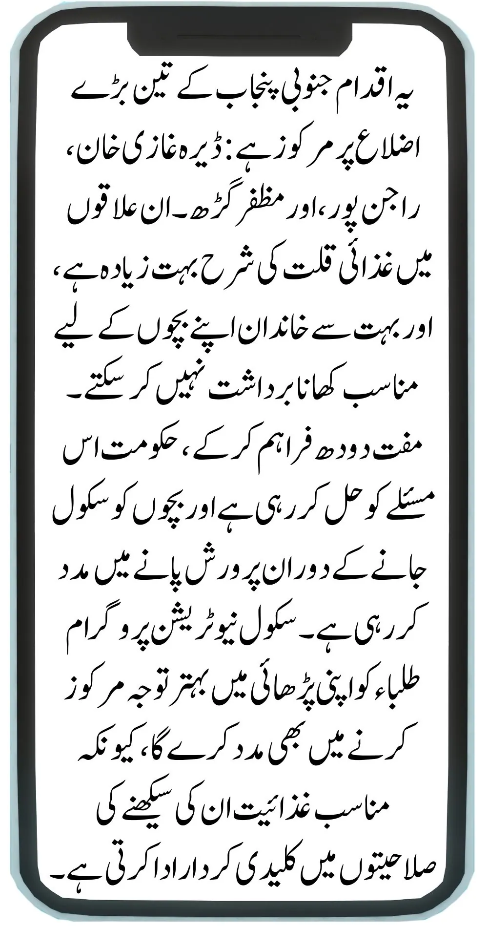 This initiative is focused on three major districts in South Punjab: Dera Ghazi Khan, Rajanpur, and Muzaffargarh. These areas have a high rate of malnutrition, and many families cannot afford proper meals for their children. By providing free milk, the government is addressing this issue and helping children stay nourished while they attend school. The School Nutrition Program will also help students concentrate better in their studies, as proper nutrition plays a key role in their learning abilities.