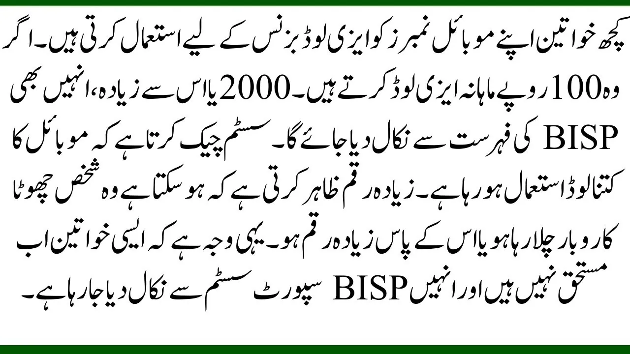 Some women use their mobile numbers for easy load businesses. If they do a monthly easy load of Rs. 2000 or more, they will also be removed from the BISP list. The system checks how much mobile load is being used. A higher amount shows that the person may be running a small business or has more money. This is why such women are now marked as not deserving and are being removed from the BISP support system.