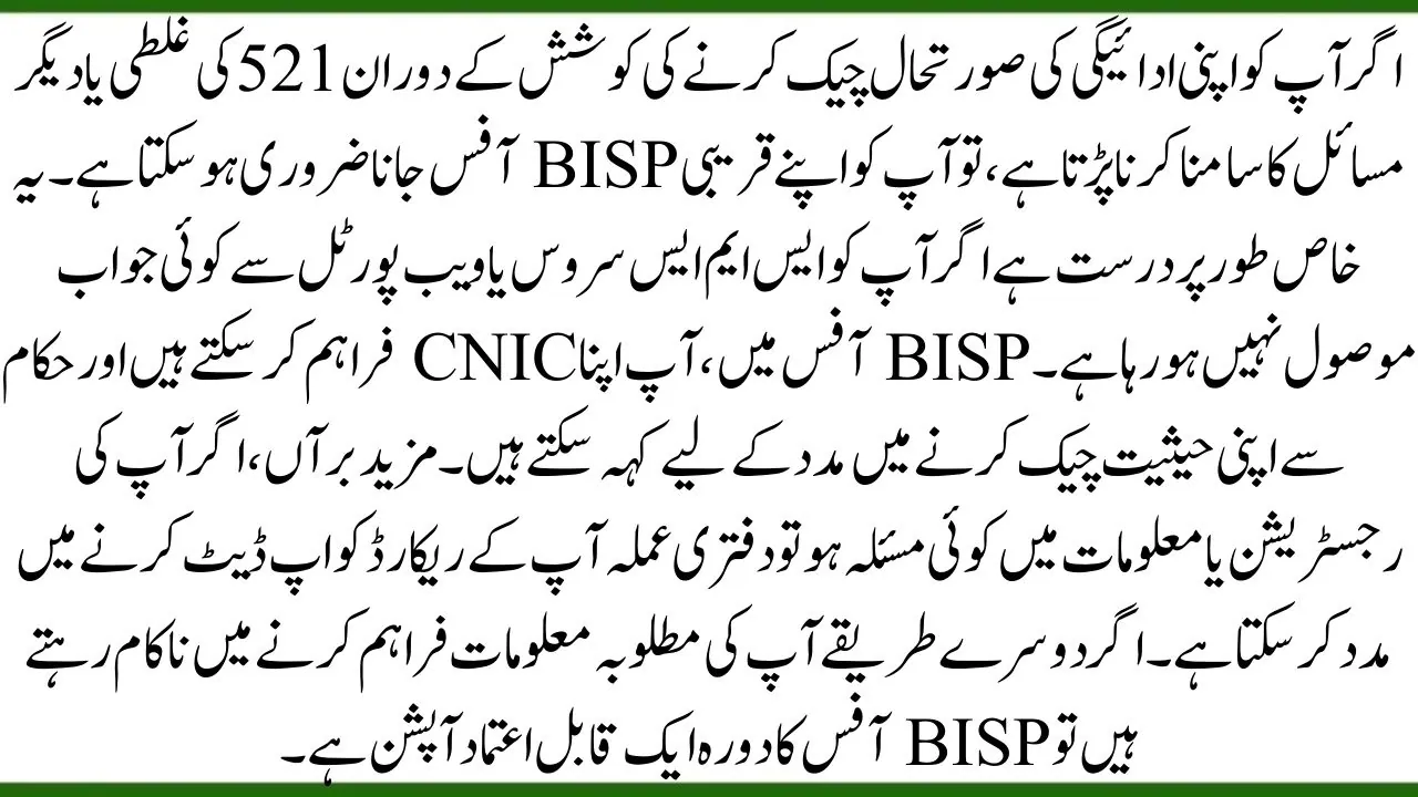 If you continue to face the 521 error or other issues while trying to check your payment status, it might be necessary to visit your nearest BISP office. This is especially true if you are not receiving a response from the SMS service or web portal. At the BISP office, you can provide your CNIC and ask the officials to help you check your status. Additionally, the office staff can assist with updating your records if there are any issues with your registration or information. Visiting the BISP office is a reliable option if other methods fail to provide the information you need.