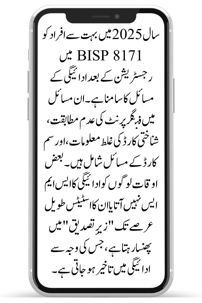 Many people in 2025 are facing BISP 8171 payment problems after registration. These include fingerprint mismatches, wrong CNIC details, and SIM issues. Sometimes, people don’t receive the payment SMS or their status is stuck in “under verification” for a long time. These problems can delay your payment. To fix these issues, it’s important to visit the BISP office or NADRA for biometric updates. Always check your CNIC and SIM details to make sure they are correct and active before visiting the payment center.