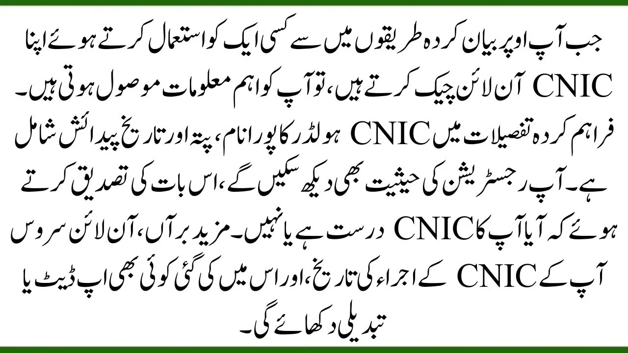 When you check your CNIC online using either of the methods mentioned above, you receive important information. The details provided include the CNIC holder’s full name, address, and birth date. You will also be able to see the registration status, confirming whether your CNIC is valid or not. Additionally, the online service will show the issue date of your CNIC, and any updates or changes made to it.