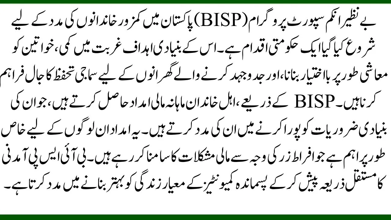 The Benazir Income Support Program (BISP) is a government initiative launched to assist vulnerable families in Pakistan. Its main goals are to reduce poverty, empower women economically, and provide a social safety net for struggling households. Through BISP, eligible families receive monthly financial aid, helping them cover their basic needs. This support is especially crucial for those facing financial difficulties due to inflation. The BISP helps improve the living standards of underprivileged communities by offering a consistent source of income.