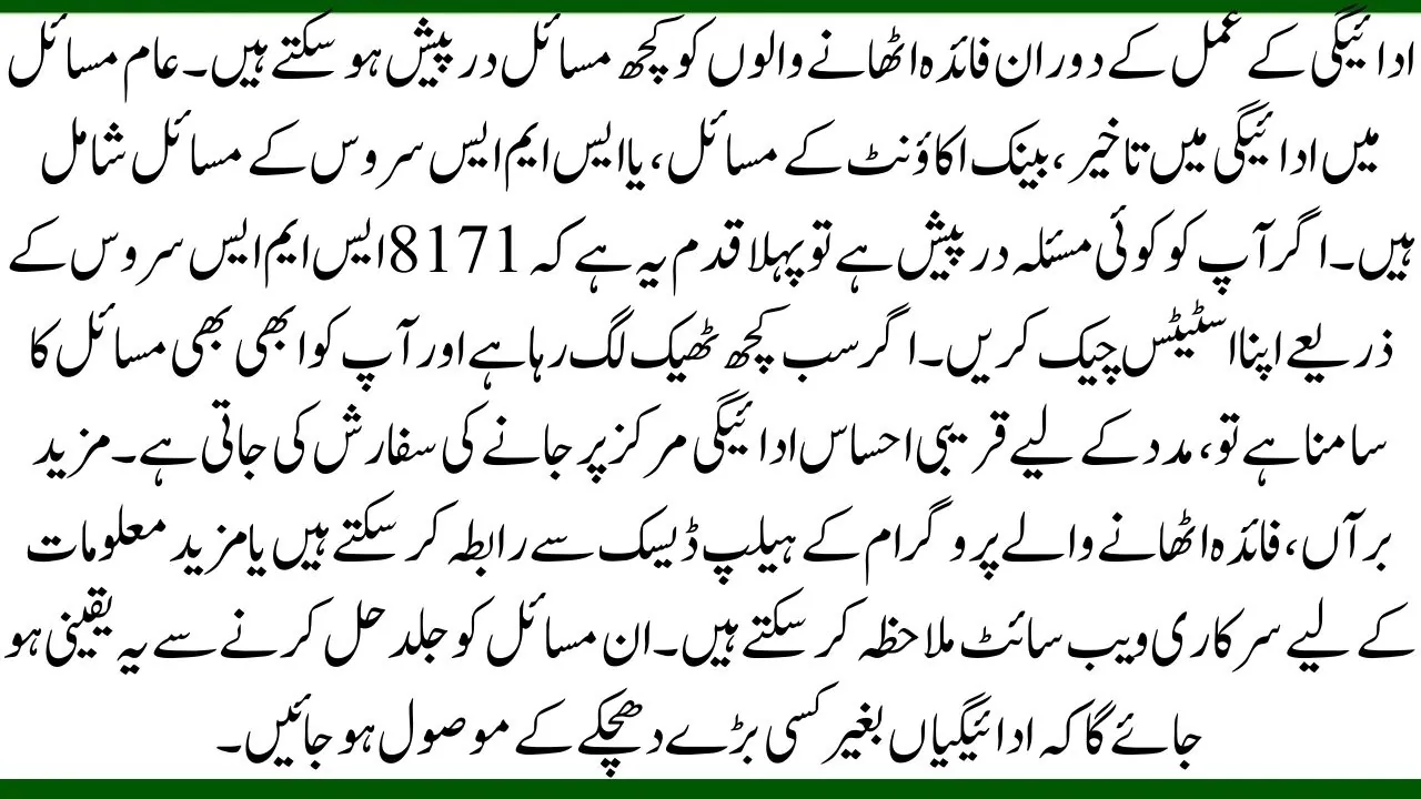 There may be some issues faced by beneficiaries during the payment process. Common problems include delays in payment, issues with the bank account, or problems with the SMS service. If you experience any issues, the first step is to check your status through the 8171 SMS service. If everything seems in order and you’re still facing problems, it is recommended to visit the nearest Ehsaas payment center for assistance. Additionally, beneficiaries can contact the program’s helpdesk or visit the official website for more information. Addressing these issues quickly will ensure that payments are received without any major setbacks.