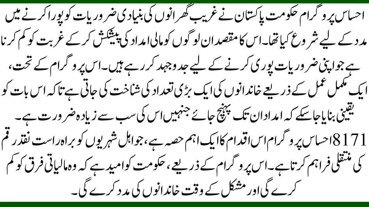 The Ehsaas Program was launched by the Government of Pakistan to help poor households meet their basic needs. It aims to alleviate poverty by offering financial aid to people who are struggling to make ends meet. Under this program, a large number of families are identified through a thorough process to ensure that the aid reaches those who need it most. The 8171 Ehsaas Program is a key part of this initiative, providing direct cash transfers to eligible citizens. With this program, the government hopes to reduce the financial gap and support families in times of hardship.
