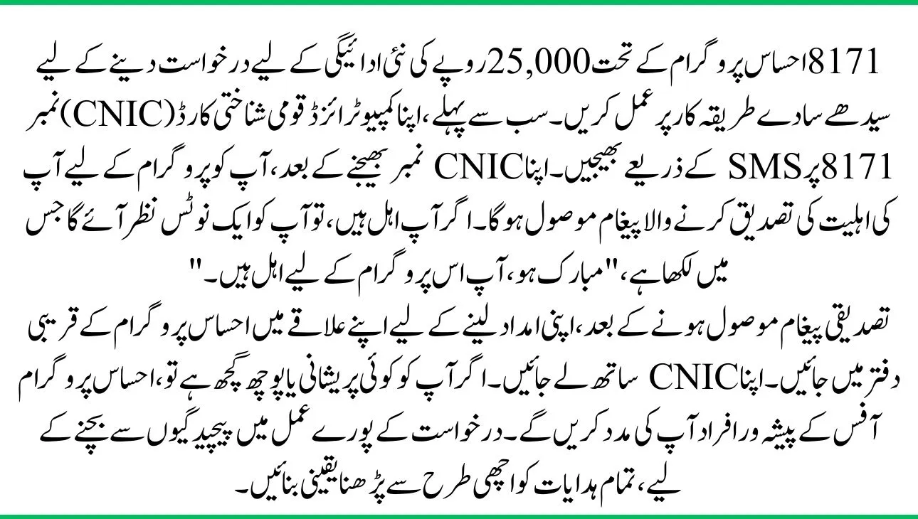 To apply for the new payment of 25,000 rupees under the 8171 Ehsaas Program, follow a straightforward procedure. First, send your Computerized National Identity Card (CNIC) number to the number 8171 by SMS. After you send your CNIC number, you will receive a message confirming your eligibility for the program. If you are eligible, you will see a notice that says, “Congratulations, you are eligible for this program.”