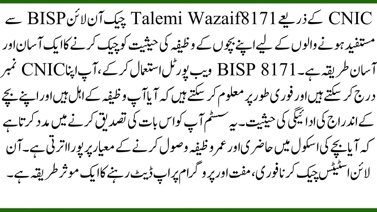 The 8171 Taleemi Wazaif Check Online by CNIC is a simple and convenient way for BISP beneficiaries to check the status of their children’s stipends. By using the BISP 8171 Web Portal, you can enter your CNIC number and instantly find out if you are eligible for the stipend and the payment status of your child’s enrollment. The system helps you verify whether the child’s school attendance and age meet the criteria for receiving the stipend. Checking the status online is quick, free, and an efficient way to stay updated on the program.