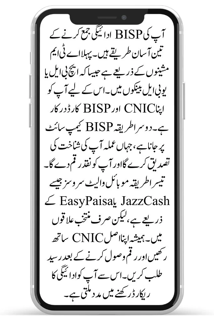 There are three easy ways to collect your BISP payment. The first is through ATM machines like those at HBL or UBL banks. You need your CNIC and BISP card for this. The second way is by going to a BISP campsite, where staff will verify your ID and give you the cash. The third method is through mobile wallet services like JazzCash or EasyPaisa, but only in selected areas. Always carry your original CNIC and ask for a receipt after receiving your money. This helps you keep a record of the payment.
