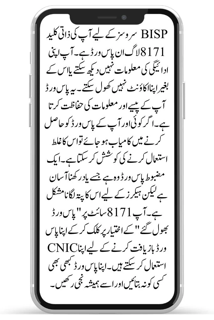 Your personal key to BISP services is the 8171 login password. You cannot view your payment information or open your account without it. This password protects your money and information. Someone else may attempt to abuse your password if they manage to gain it. A strong password is one that is simple to remember but difficult for hackers to figure out. You can use your CNIC to retrieve your password by clicking the “Forgot Password” option on the 8171 site. Never divulge your password to anybody and always keep it private.