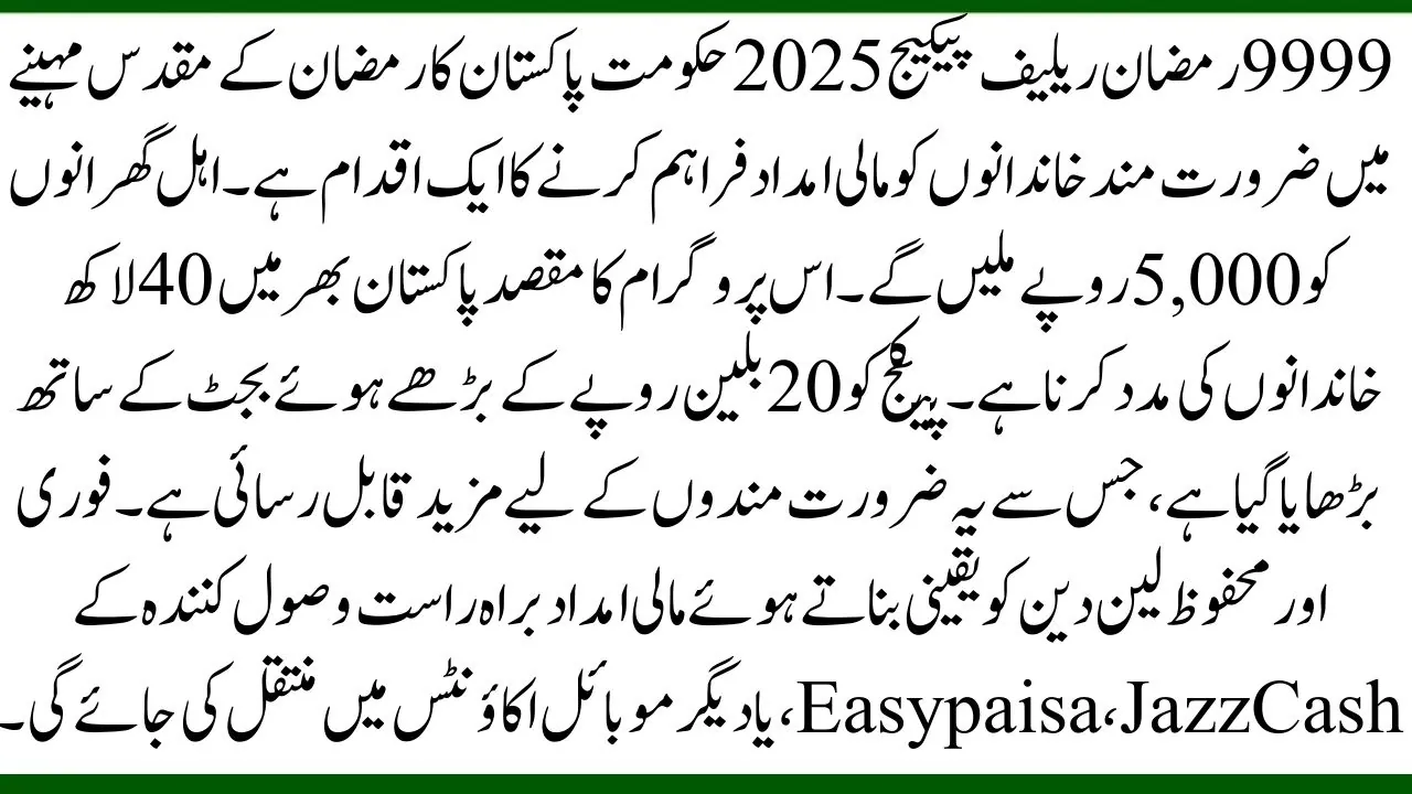 The 9999 Ramzan Relief Package 2025 is an initiative by the Government of Pakistan to provide financial aid to families in need during the holy month of Ramadan. Eligible households will receive Rs 5,000. This program aims to assist 40 lakh families across Pakistan. The package has been expanded with an increased budget of Rs 20 billion, making it more accessible to those in need. The financial assistance will be transferred directly to the recipient’s Easypaisa, JazzCash, or other mobile accounts, ensuring quick and secure transactions.
