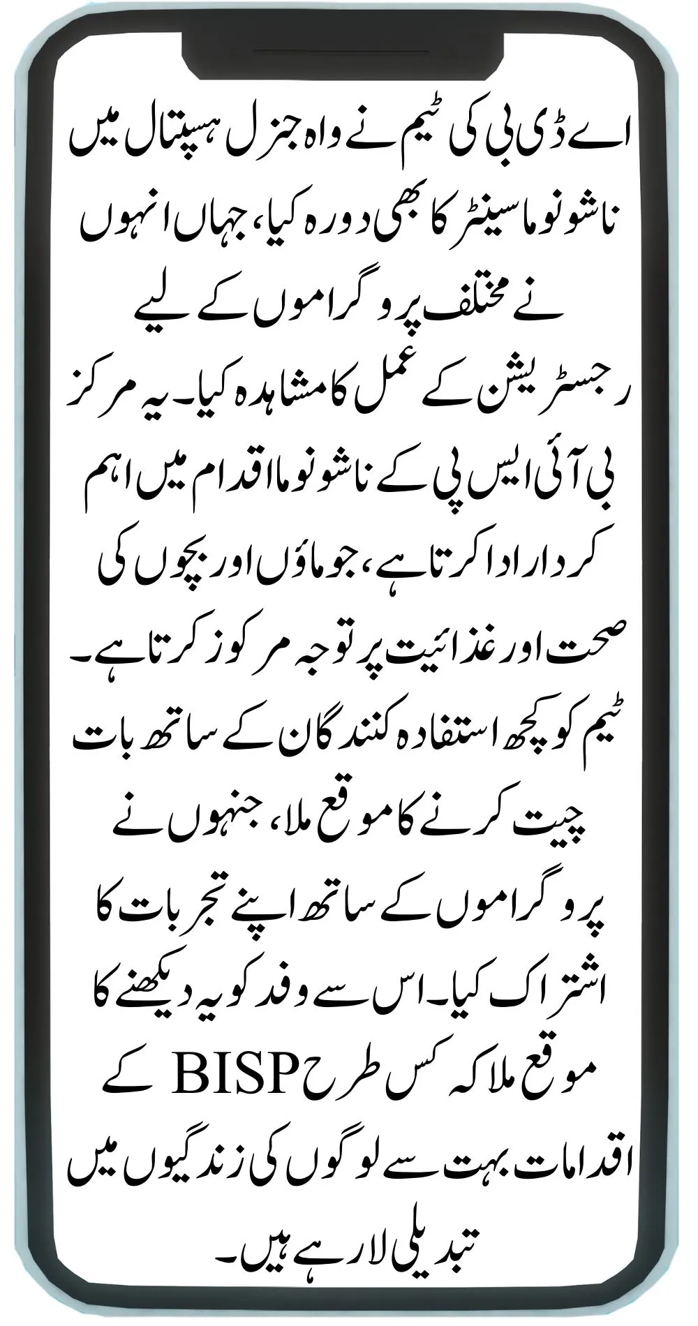 The ADB team also visited the Nashonuma Centre at Wah General Hospital, where they observed the registration process for various programs. This center plays a significant role in BISP’s Nashonuma initiative, which focuses on the health and nutrition of mothers and children. The team got the opportunity to interact with some of the beneficiaries, who shared their experiences with the programs. This allowed the delegation to see firsthand how BISP’s initiatives are making a difference in the lives of many.