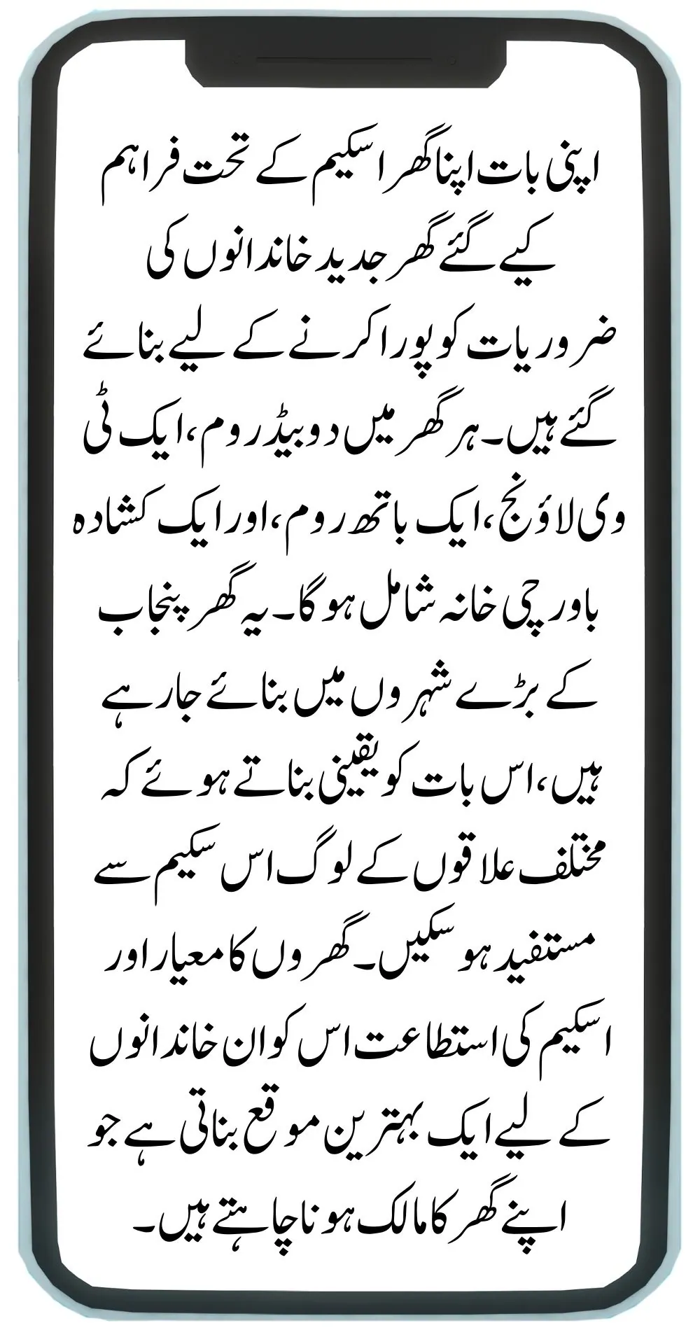 The homes provided under the Apni Chat Apna Ghar scheme are designed to meet the needs of modern families. Each home will include two bedrooms, a TV lounge, a bathroom, and a spacious kitchen. These homes are being developed across major cities in Punjab, ensuring that people from different regions can benefit from the scheme. The quality of the homes and the affordability of the scheme make this a great opportunity for families looking to own their own homes.
