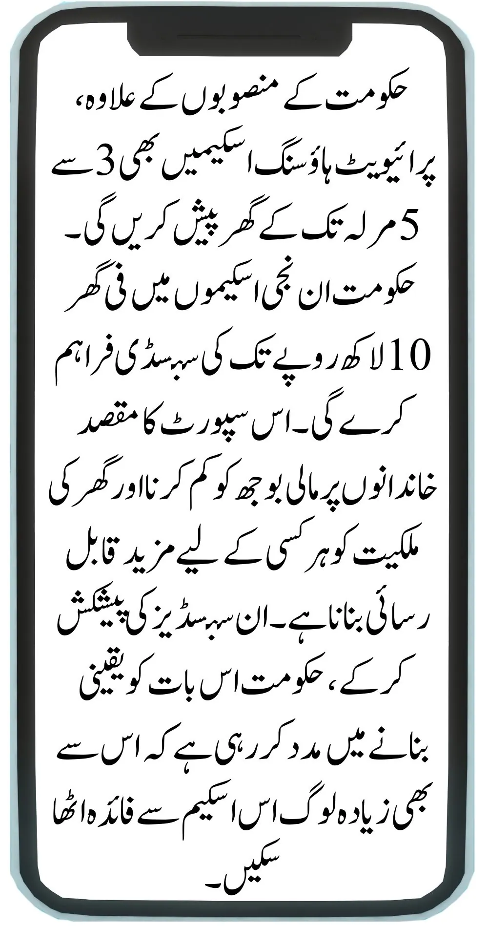 In addition to the government’s plans, private housing schemes will also offer homes ranging from 3 to 5 marlas. The government will provide subsidies of up to Rs1 million per house in these private schemes. This support aims to reduce the financial burden on families and make homeownership more accessible to everyone. By offering these subsidies, the government is helping to ensure that even more people can benefit from the scheme.
