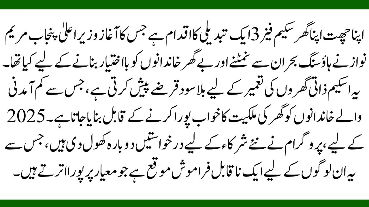 The Apni Chhat Apna Ghar Scheme Phase 3 is a transformative initiative launched by Punjab Chief Minister Maryam Nawaz to address the housing crisis and empower homeless families. This scheme offers interest-free loans for constructing personal homes, enabling low-income families to achieve their dream of homeownership. For 2025, the program has reopened applications for new participants, making it an unmissable opportunity for those who meet the criteria.