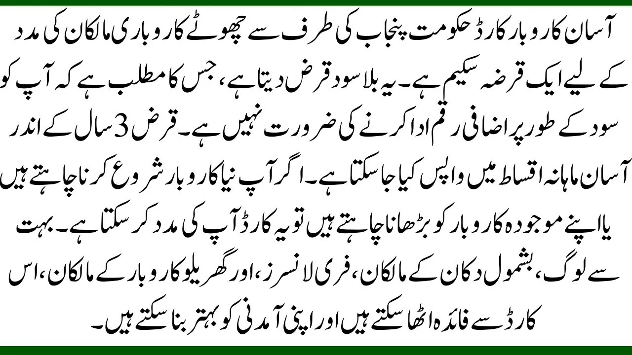 The Asaan Karobar Card is a loan scheme by Government of Punjab to help small business owners. It gives interest-free loans, which means you do not need to pay extra money as interest. The loan can be paid back in easy monthly installments within 3 years. This card can help you if you want to start a new business or grow your current one. Many people, including shop owners, freelancers, and home-based business owners, can benefit from this card and improve their income.
