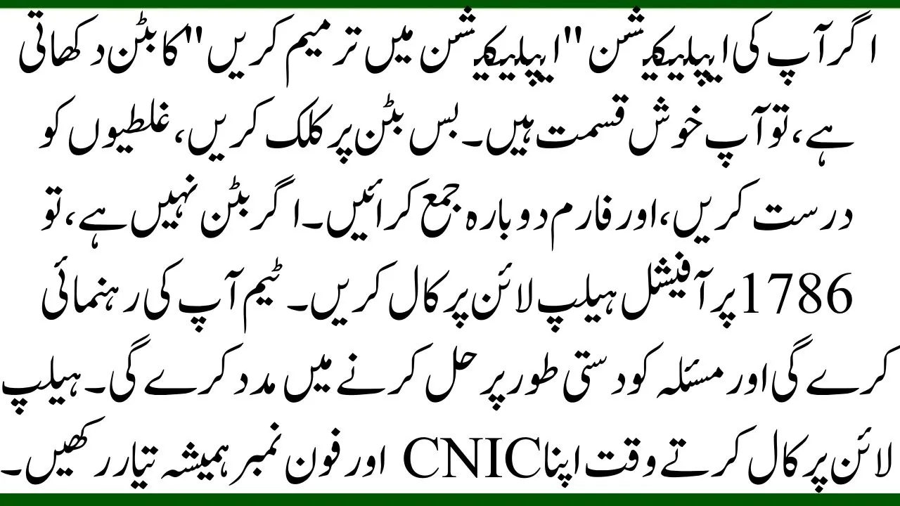 If your application shows the “Edit Application” button, then you are lucky. Just click the button, correct the mistakes, and submit the form again. If the button is not there, then call the official helpline at 1786. The team will guide you and help fix the issue manually. Always keep your CNIC and phone number ready when calling the helpline.
