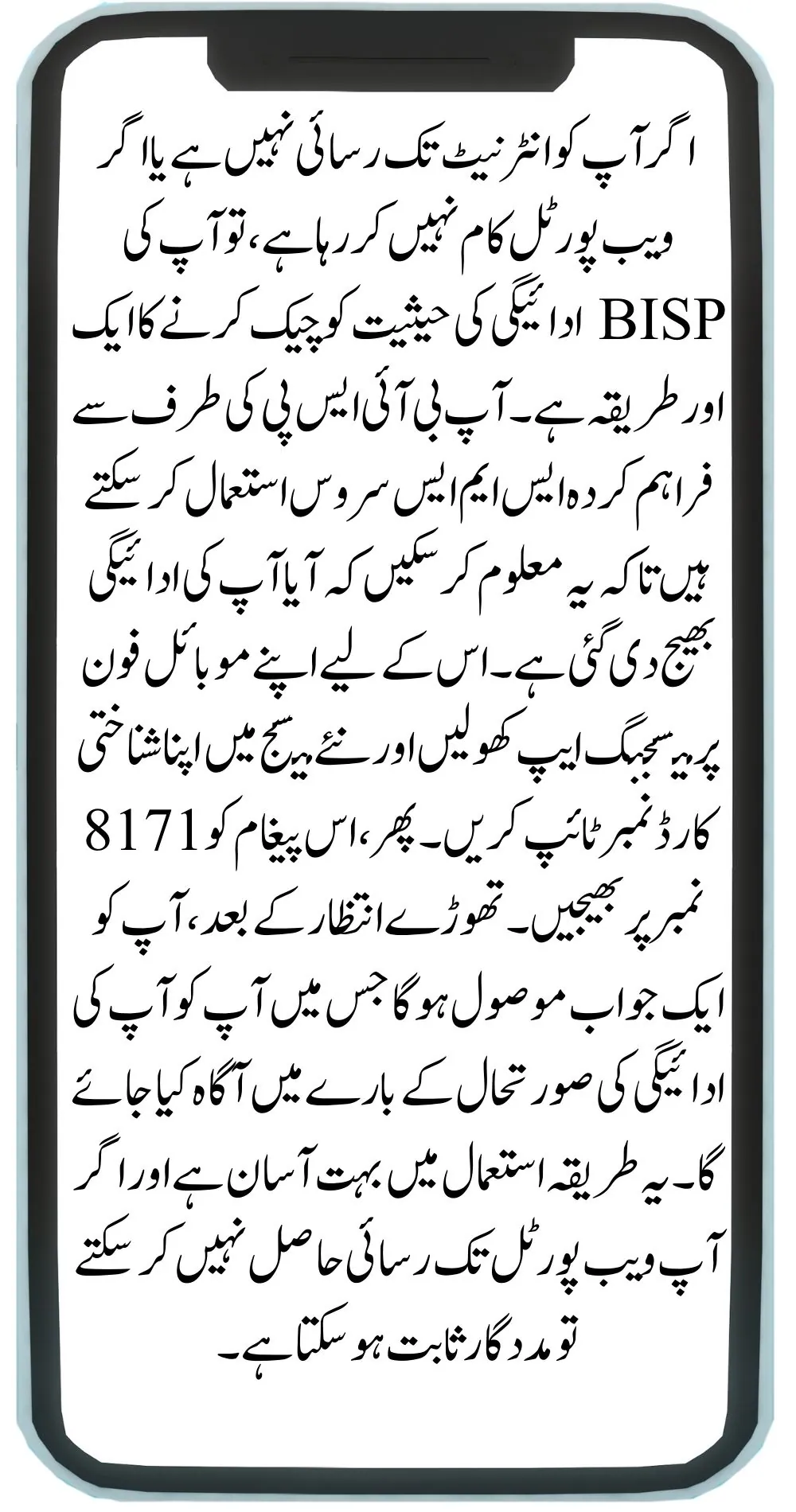 If you do not have access to the internet or if the web portal is not working, there is another way to check your BISP payment status. You can use the SMS service provided by BISP to quickly find out if your payment has been sent. To do this, open the messaging app on your mobile phone and type your ID card number in a new message. Then, send this message to the number 8171. After a short wait, you will receive a reply informing you about your payment status. This method is very easy to use and can be helpful if you cannot access the web portal.