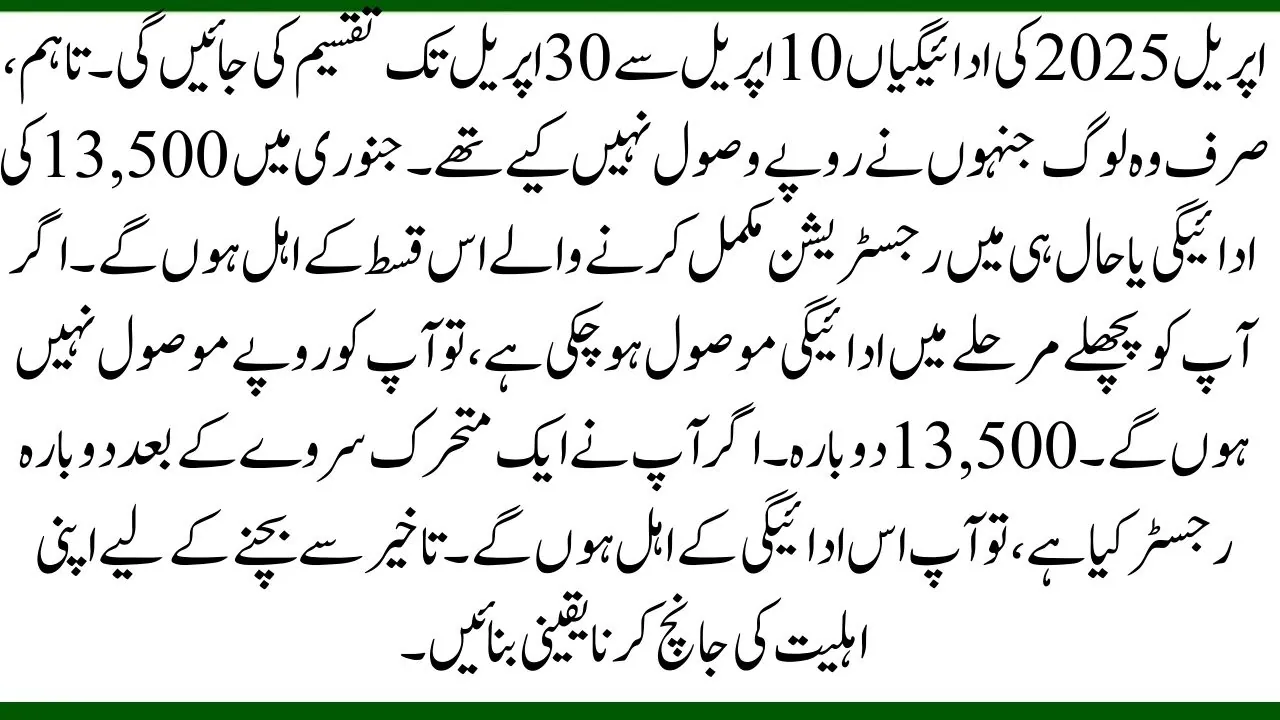 Payments for April 2025 will be distributed from April 10 to April 30. However, only those who did not receive the Rs. 13,500 payment in January or have recently completed their registration will be eligible for this installment. If you have already received the payment in a previous phase, you will not receive the Rs. 13,500 again. If you have re-registered after a dynamic survey, you will be eligible for this payment. Make sure to check your eligibility to avoid delays.