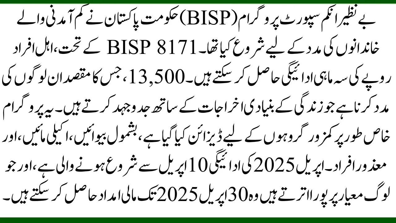 The Benazir Income Support Program (BISP) was launched by the Government of Pakistan to help low-income families. Under the BISP 8171, eligible individuals can receive a quarterly payment of Rs. 13,500, aimed at supporting those who struggle with basic living expenses. The program is specifically designed for vulnerable groups, including widows, single mothers, and people with disabilities. The payment for April 2025 is set to begin on April 10, and those who meet the criteria can receive financial support until April 30, 2025.