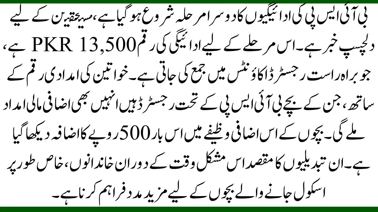 The second phase of BISP payments has started, bringing exciting news for beneficiaries. The payment amount for this phase is PKR 13,500, which is directly deposited into the registered accounts. Along with the women’s support amount, those who have children registered under BISP will also receive additional financial assistance. This extra child stipend has seen an increase of PKR 500 this time. These changes are intended to provide more support to families, especially those with school-going children, during this difficult time.