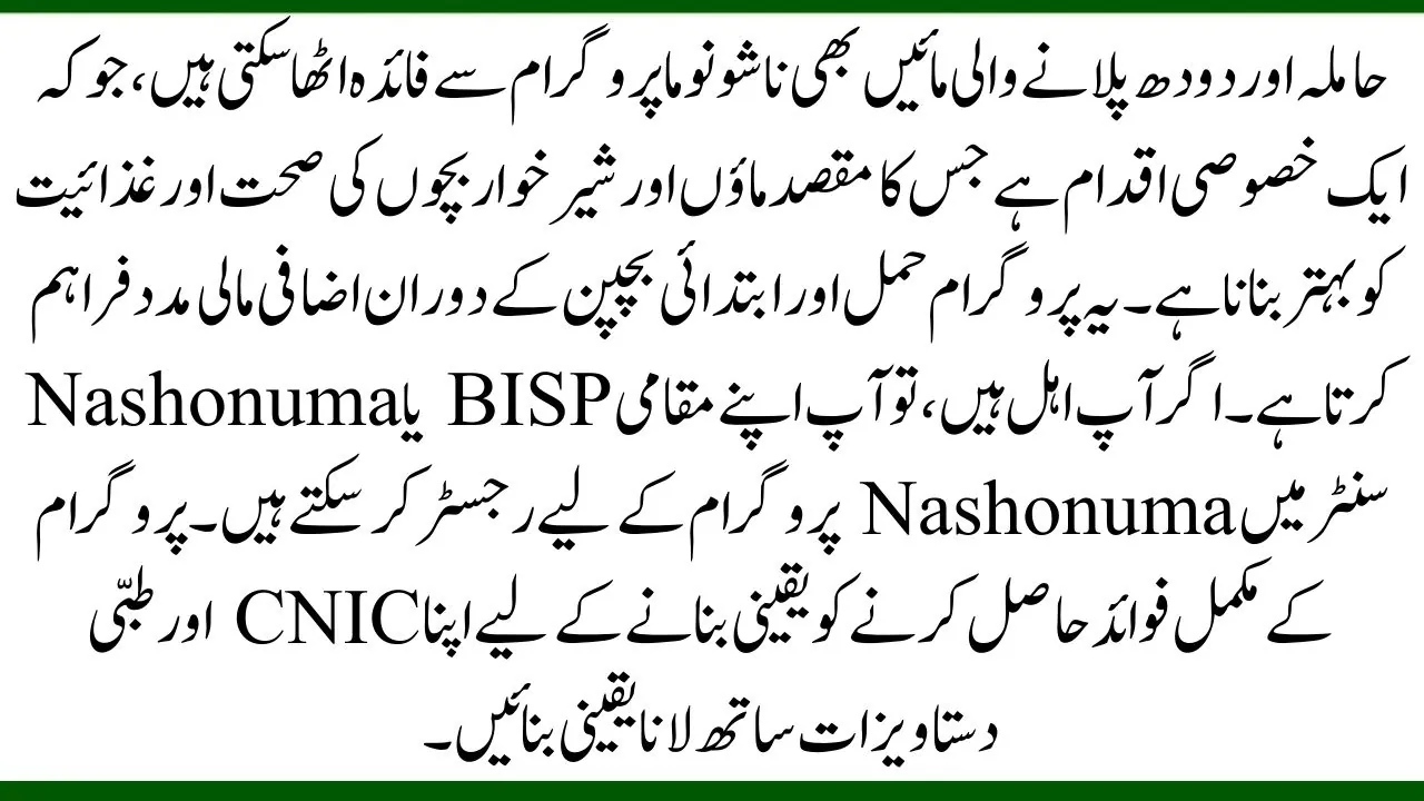 Pregnant and nursing mothers can register for the program by visiting their nearest BISP or Nashonuma center with their CNIC and medical documents.