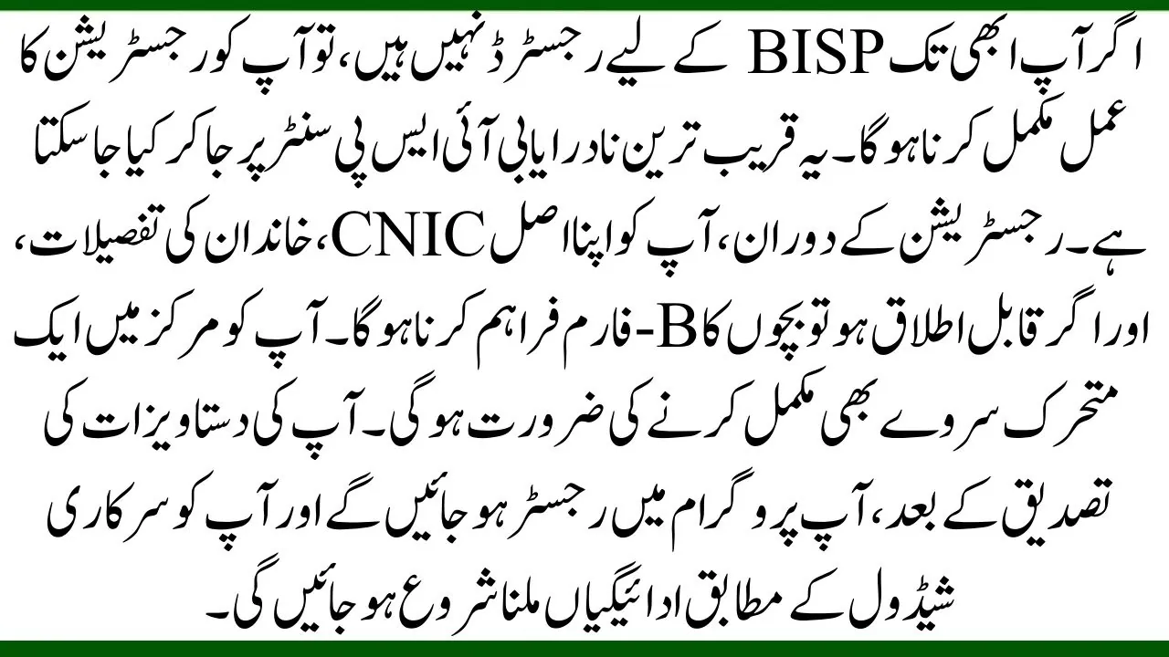 If you are not yet registered for BISP, you need to complete the registration process. This can be done by visiting the nearest NADRA or BISP center. During registration, you will need to provide your original CNIC, family details, and children’s B-Form if applicable. You will also need to complete a dynamic survey at the center. After verification of your documents, you will be registered in the program and will start receiving payments according to the official schedule.