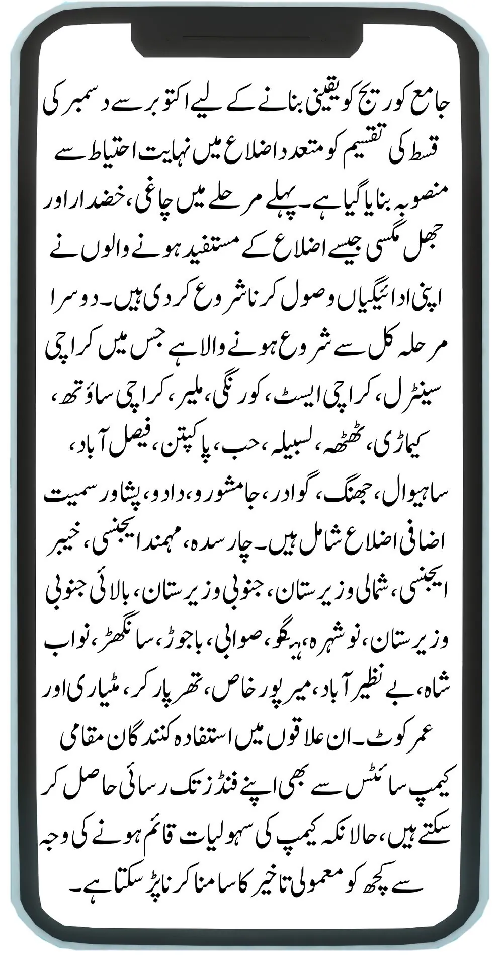 The distribution of the October to December installment is meticulously planned across multiple districts to ensure comprehensive coverage. In the first phase, beneficiaries from districts like Chagai, Khuzdar, and Jhal Magsi, among others, have already started receiving their payments. The second phase is set to begin tomorrow, covering additional districts including Karachi Central, Karachi East, Korangi, Malir, Karachi South, Kemari, Thatta, Lasbela, Hub, Pakpattan, Faisalabad, Sahiwal, Jhang, Gwadar, Jamshoro, Dadu, Peshawar, Charsadda, Mohmand Agency, Khyber Agency, North Waziristan, South Waziristan, Upper South Waziristan, Nowshera, Hangu, Swabi, Bajaur, Sanghar, Nawabshah, Benazirabad, Mirpur Khas, Tharparkar, Matiari, and Umerkot. Beneficiaries in these areas can also access their funds from local camp sites, although some may experience slight delays as camp facilities are being set up.