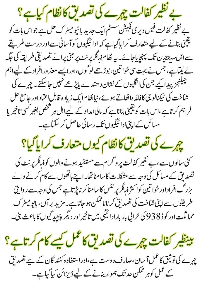 The Benazir Kafalat Face Verification System is a modern biometric solution introduced to ensure that payments are delivered smoothly and accurately to eligible beneficiaries. This system replaces the outdated fingerprint-based verification method, which posed significant challenges for many women, elderly people, and individuals with disabilities whose fingerprints might be faded or unreadable. By leveraging facial recognition technology, the new system provides a more reliable and inclusive solution, ensuring that everyone eligible for financial aid can access their payments without delays or issues.