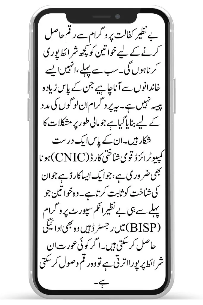 To receive the money from the Benazir Kafalat Program, women need to meet certain conditions. First, they should come from families that don’t have a lot of money. The program is designed to help those who are struggling financially. They also need to have a valid Computerized National Identity Card (CNIC), which is a card that proves their identity. Women who are already registered with the Benazir Income Support Program (BISP) can also receive the payment. If a woman meets these conditions, she can receive the payment.