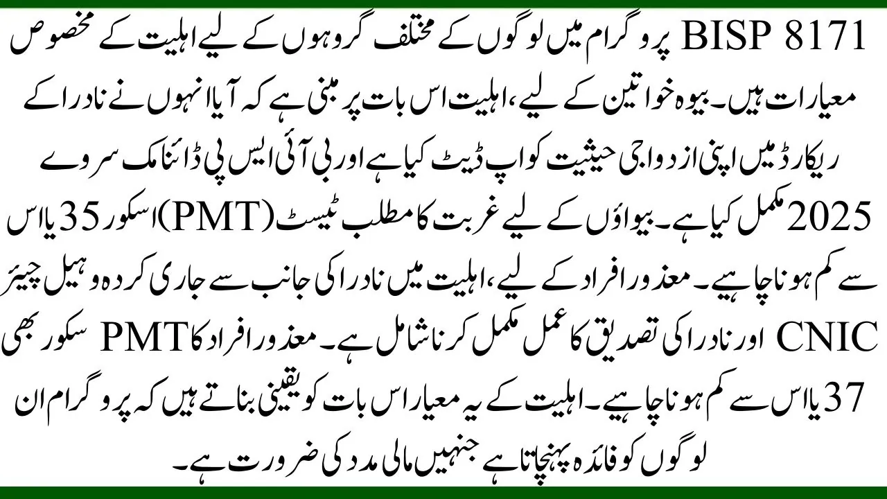 The BISP 8171 program has specific eligibility criteria for different groups of people. For widowed women, eligibility is based on whether they have updated their marital status in the NADRA records and completed the BISP Dynamic Survey 2025. The Poverty Means Test (PMT) score for widows should be 35 or below. For disabled persons, eligibility includes having a wheelchair CNIC issued by NADRA and completing the NADRA verification process. Disabled individuals must also have a PMT score of 37 or below. These eligibility criteria ensure that the program benefits those most in need of financial support.