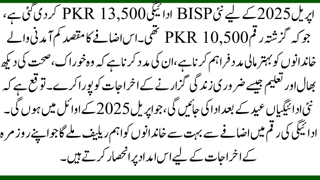 The new BISP payment for April 2025 has been increased to PKR 13,500, up from the previous amount of PKR 10,500. This increment is aimed at offering better financial support to low-income families, helping them cover essential living costs such as food, healthcare, and education. The new payments are expected to be disbursed after Eid, which will be in early April 2025. The increase in the payment amount will provide significant relief to many families who rely on this assistance for their day-to-day expenses.
