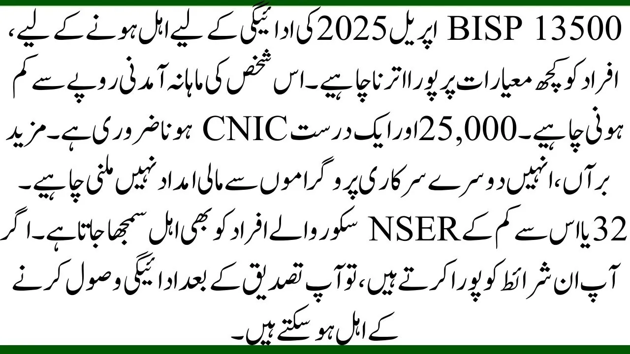 To qualify for the BISP 13500 payment in April 2025, there are some criteria that must be met. First, the person should have a monthly income of less than Rs 25,000.Yhey should not be getting financial support from other government programs. If your NSER score is 32 or lower, you are also deemed eligible. After checking your details, you may be able to receive the payment.