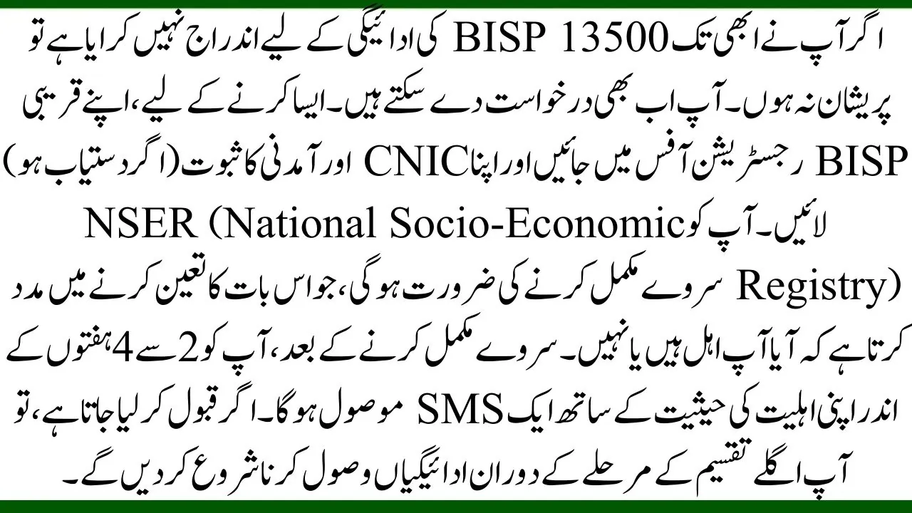 If you are not yet registered for the BISP 13500 payment, it’s not too late. You can still apply for the program. To register, visit nearest BISP office and bring the CNIC along with proof of income. You will need to complete the NSER survey, which helps determine if you qualify for the program. After completing the survey, you will get an SMS within 2 to 4 weeks about your eligibility status. If you are accepted, you will start receiving payments in the next distribution phase.