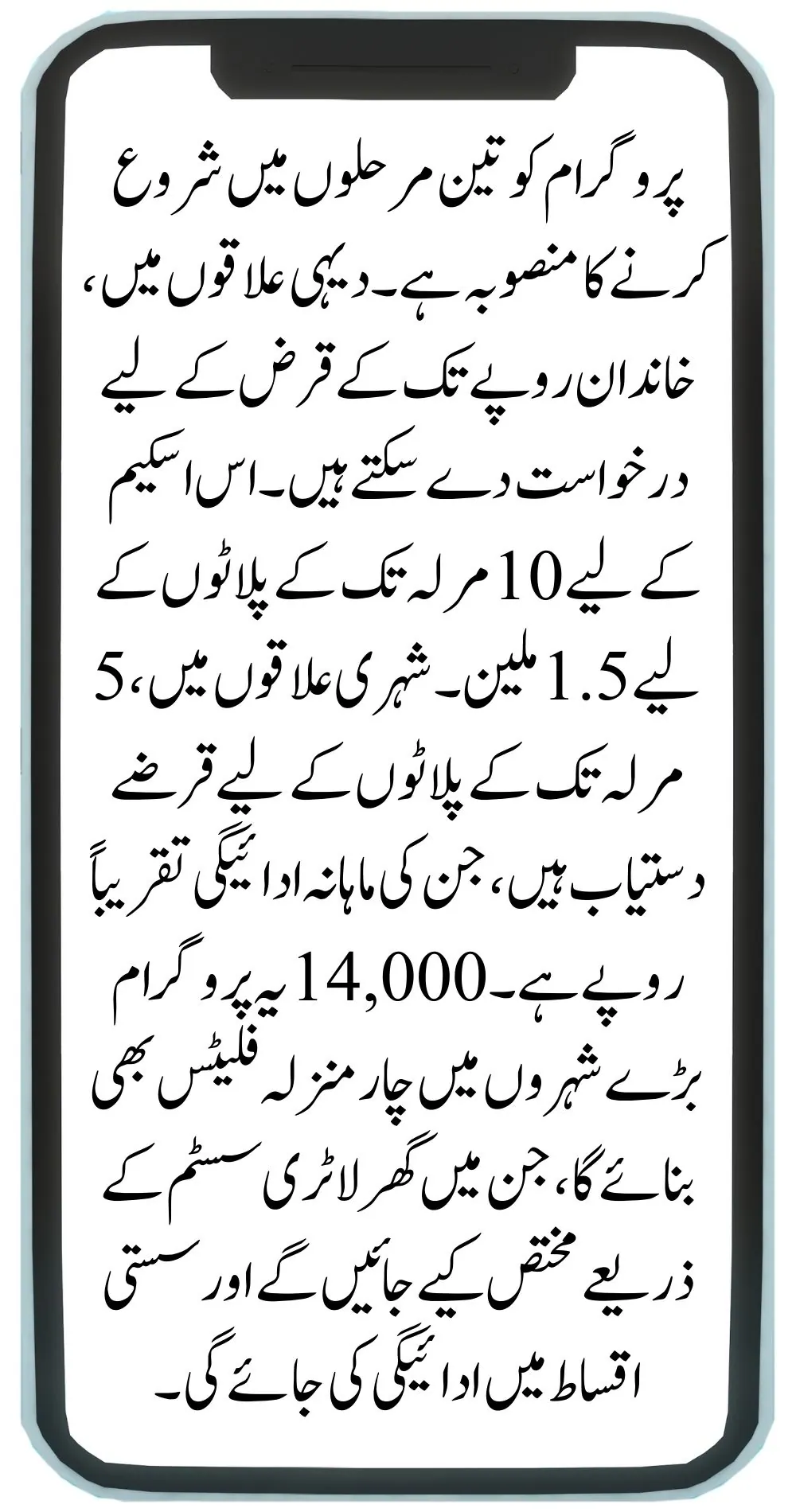 The program is planned to roll out in three phases. In rural areas, families can apply for loans up to Rs. 1.5 million for plots up to 10 marlas for this scheme. In urban areas, loans are available for plots up to 5 marlas, with monthly repayments around Rs. 14,000. The program will also build four-story flats in major cities, with homes allocated through a lottery system and paid off in affordable installments.