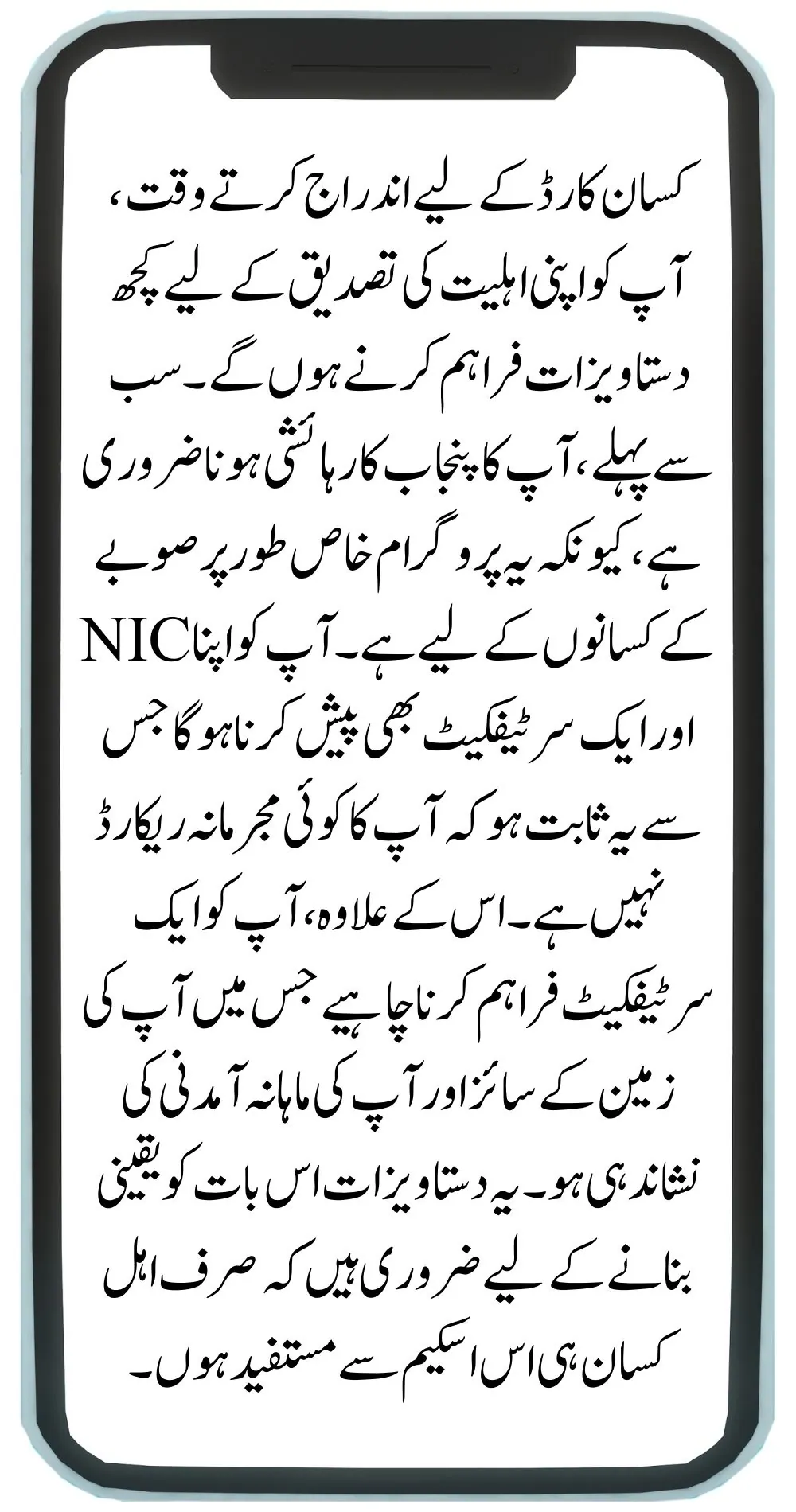 When registering for the Kisan Card, you must provide certain documents to confirm your eligibility. First, you need to be a resident of Punjab, as this program is specifically for farmers in the province. You will also need to present your NIC and a certificate proving that you have no criminal record. Additionally, you must provide a certificate indicating the size of your land and your monthly income. These documents are necessary to ensure that only eligible farmers benefit from the scheme.