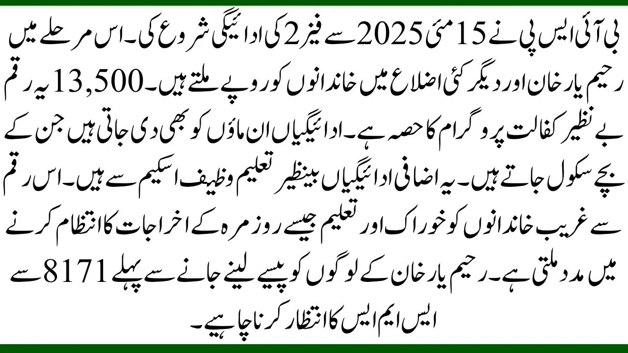BISP started Phase 2 payments from 15 May 2025. In this phase, families in Rahim Yar Khan and many other districts receive Rs. 13,500. This money is part of the Benazir Kafalat program. Payments are also given to mothers whose children go to school. These extra payments are from Benazir Taleemi Wazaif scheme. The money helps poor families to manage everyday expenses like food and education. People in Rahim Yar Khan should wait for an SMS from 8171 before going to collect the money.
