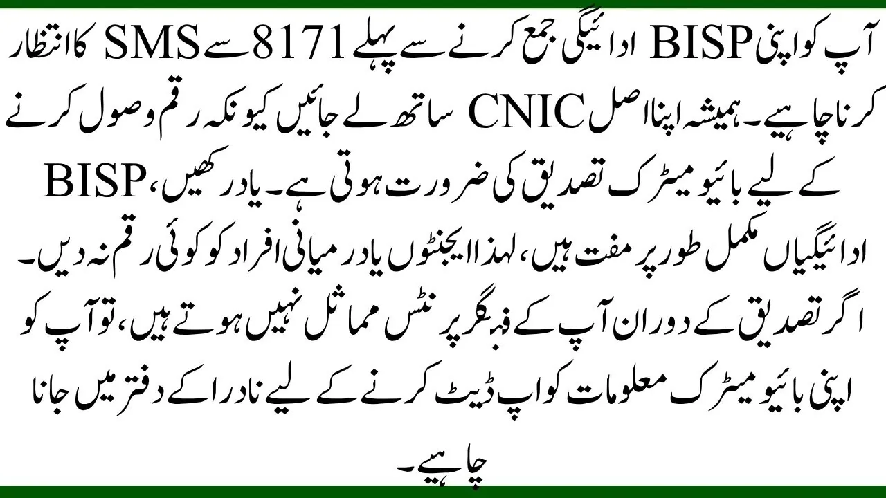 You should wait for the SMS from 8171 before going to collect your BISP payment. Always take your original CNIC with you because biometric verification is required to receive the money. Remember, BISP payments are completely free, so do not give any money to agents or middlemen. If your fingerprints do not match during verification, you should visit a NADRA office to update your biometric information.