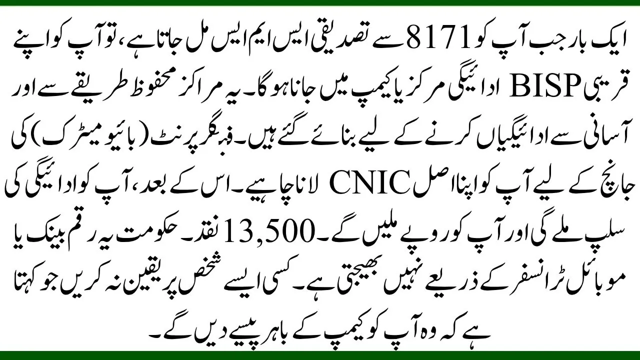 Once you get the confirmation SMS from 8171, you need to go to your nearest BISP payment center or camp. These centers are made to give payments safely and easily. You must bring your original CNIC for fingerprint (biometric) checking. After that, you will receive a payment slip and get Rs. 13,500 in cash. The government does not send this money through bank or mobile transfer. Do not believe anyone who says they will give you money outside the camp.