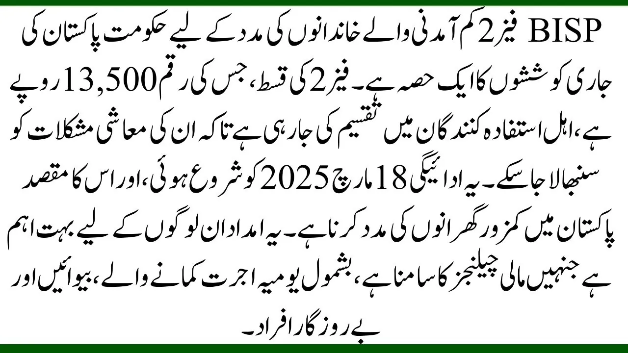 BISP Phase 2 is a part of the Government of Pakistan’s ongoing efforts to assist low-income families. The Phase 2 installment, amounting to 13,500 rupees, is being distributed to eligible beneficiaries to help them manage economic difficulties. The payment started on March 18, 2025, and is intended to support vulnerable households in Pakistan. This assistance is crucial for those facing financial challenges, including daily wage earners, widows, and unemployed individuals.