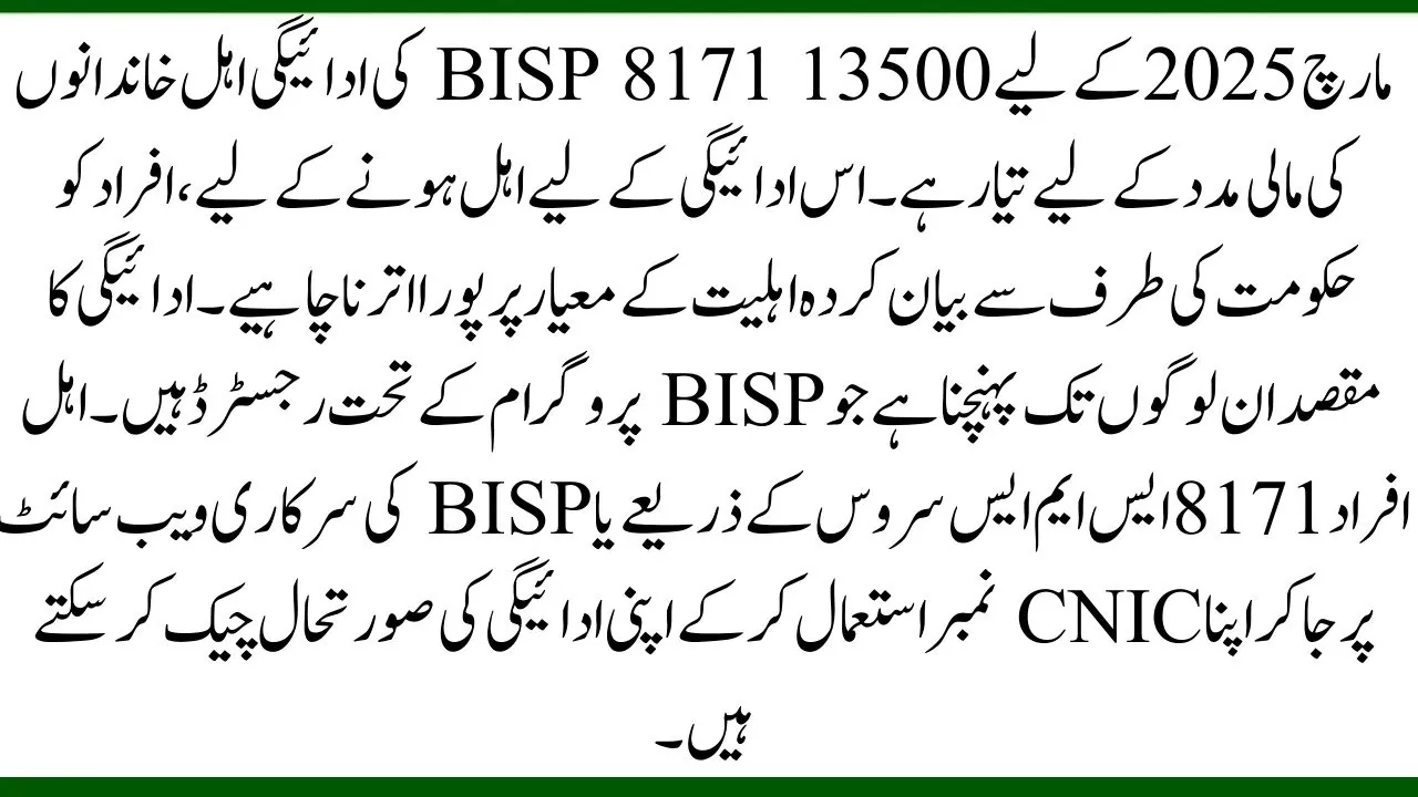The BISP 8171 13500 payment for March 2025 is set to assist eligible families with financial support. To qualify for this payment, individuals must meet the eligibility criteria outlined by the government. The payment aims to reach those who are registered under the BISP program. Those eligible can check their payment status by using their CNIC number via the 8171 SMS service or by visiting the official BISP website.