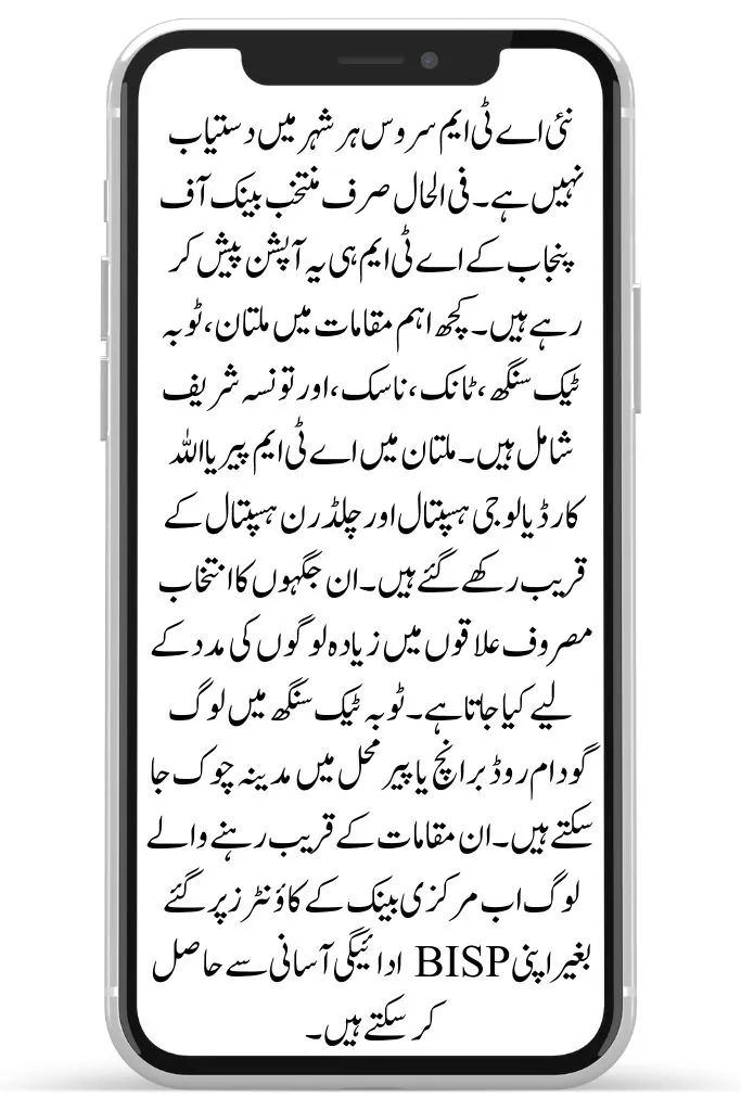 The new ATM service is not available in every city. Only selected Bank of Punjab ATMs are offering this option for now. Some main locations include Multan, Toba Tek Singh, Tank, Nashek, and Tunsa Sharif. In Multan, the ATMs are placed near Piria Allahi Cardiology Hospital and Children’s Hospital. These places are chosen to help more people in busy areas. In Toba Tek Singh, people can go to Godam Road Branch or Madina Chowk in Pir Mahal. People living near these locations can now get their BISP payments easily without visiting main bank counters.