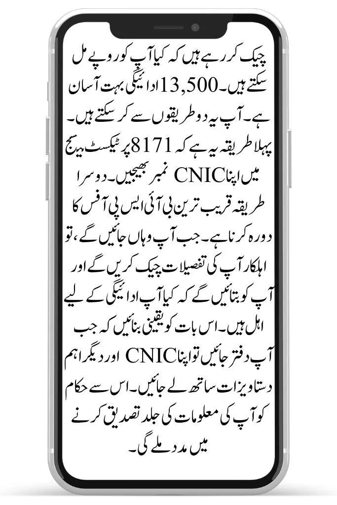 To check if you are eligible for the Rs. 13,500 payment, you can send your CNIC number to 8171 via SMS. After sending the message, you will receive a reply telling you if you qualify or not. Alternatively, you can visit a nearby BISP office, where officials will check your information and confirm whether you are eligible for the payment.