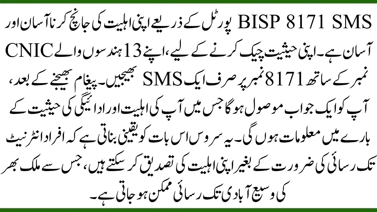 | How to Check Eligibility via SMS | Send your 13-digit CNIC to 8171. You’ll receive an SMS with eligibility details. |