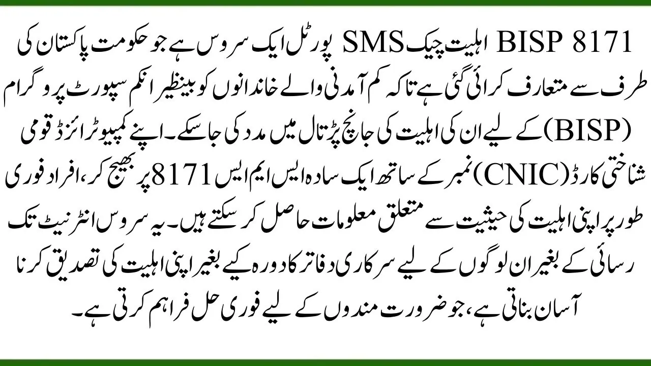 The BISP 8171 Eligibility Check SMS Portal is a service introduced by the Government of Pakistan to help low-income families check their eligibility for the Benazir Income Support Program (BISP). By sending a simple SMS with their Computerized National Identity Card (CNIC) number to the number 8171, individuals can instantly receive information regarding their eligibility status. This service makes it easy for those without internet access to verify their eligibility without visiting government offices, providing a quick solution for those in need.