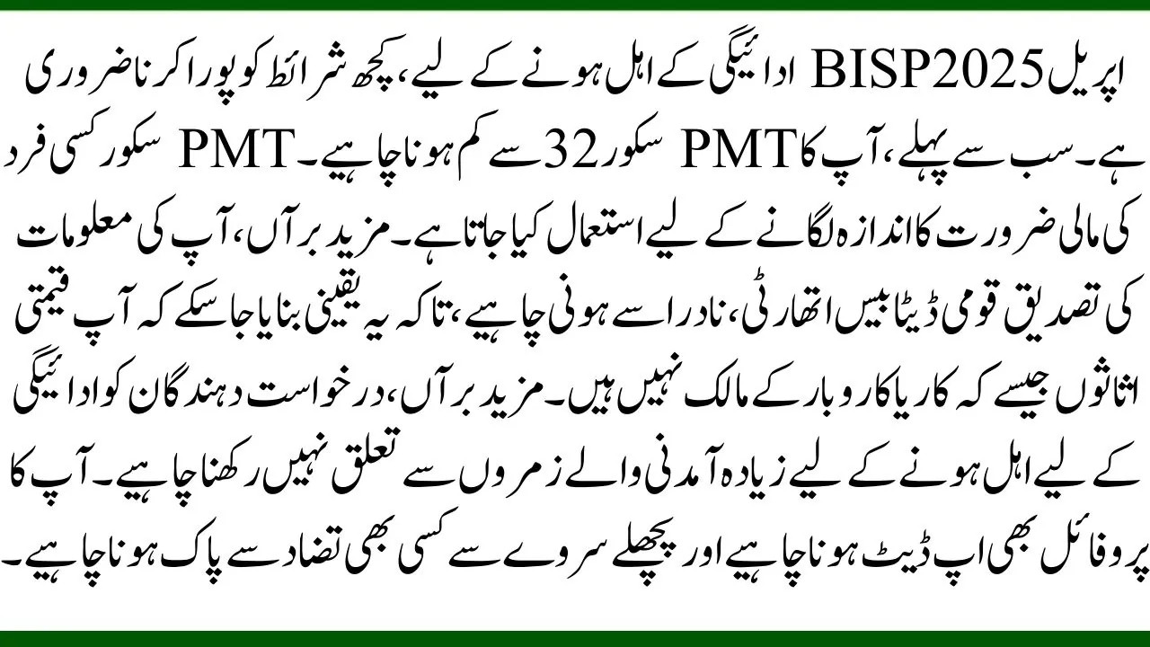 To be eligible for the April 2025 BISP payment, certain conditions must be met. First, your PMT score must be below 32. The PMT score is used to assess an individual’s financial need. Furthermore, your information must be verified by NADRA, the national database authority, to ensure that you do not own valuable assets such as a car or a business. Additionally, applicants must not belong to high-income categories to qualify for the payment. Your profile must also be updated and clear of any discrepancies from previous surveys.