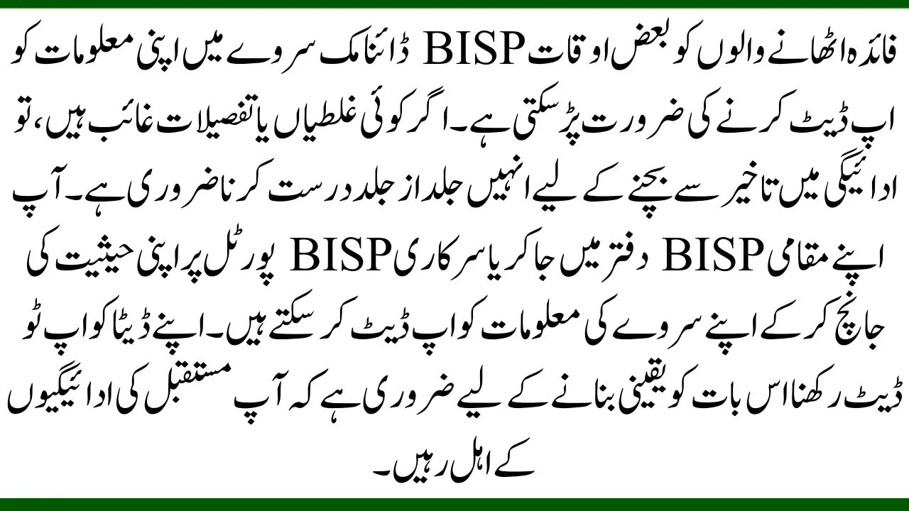 Beneficiaries may sometimes need to update their information in the BISP dynamic survey. If there are any errors or missing details, it’s essential to correct them as soon as possible to avoid payment delays. You can update your survey information by visiting your local BISP office or checking your status on the official BISP portal. Keeping your data up-to-date is vital to ensure you remain eligible for future payments.